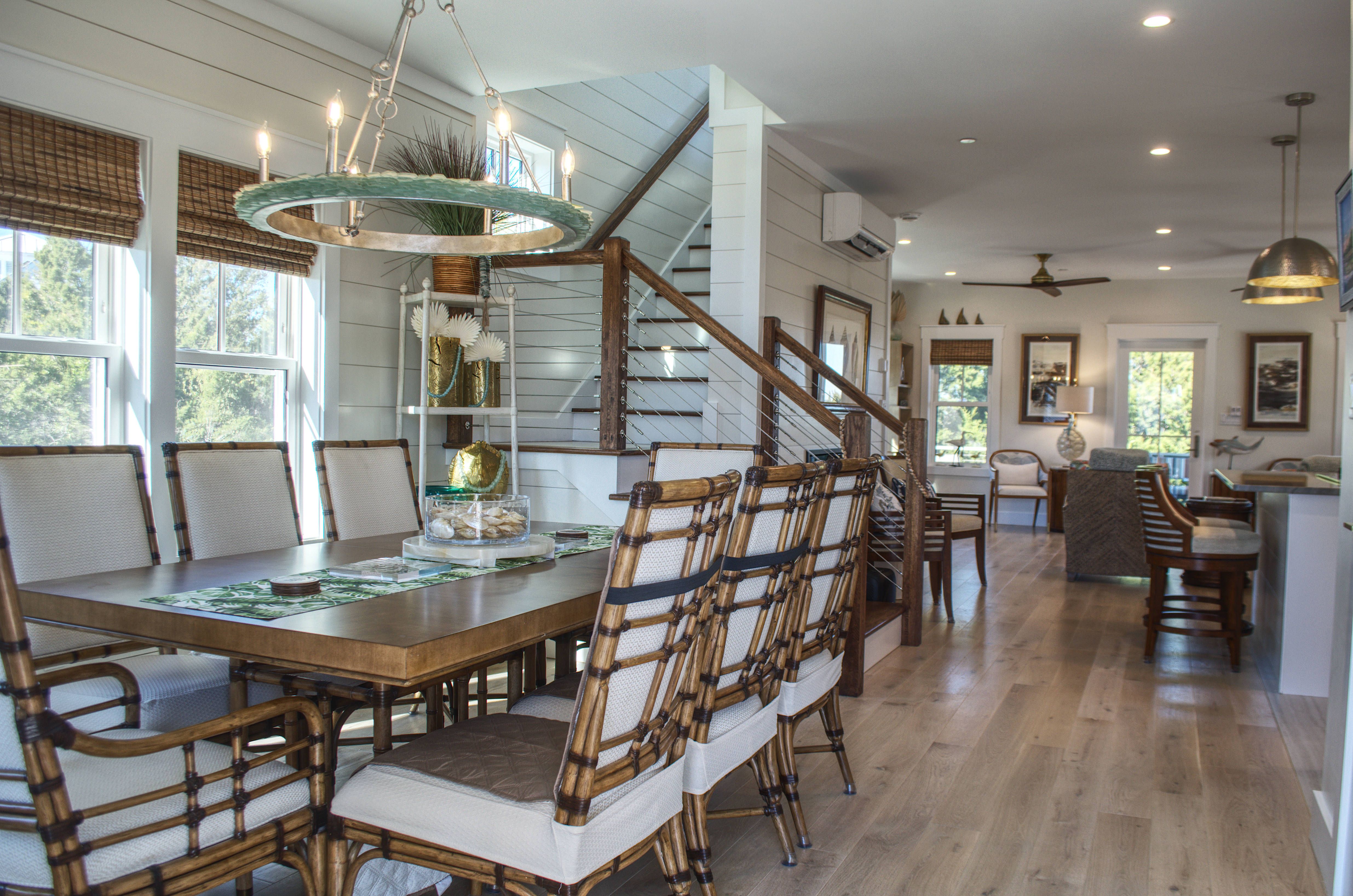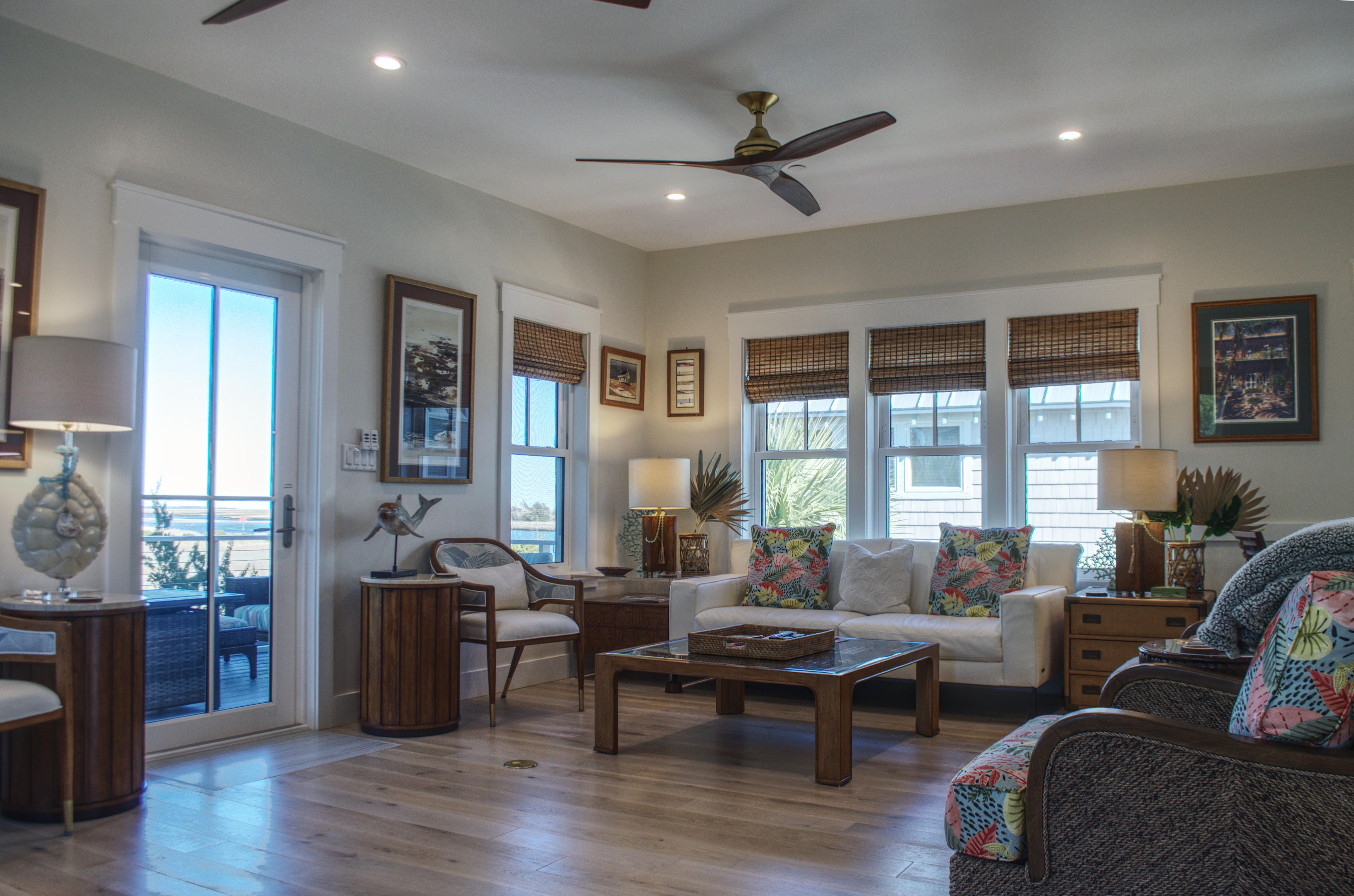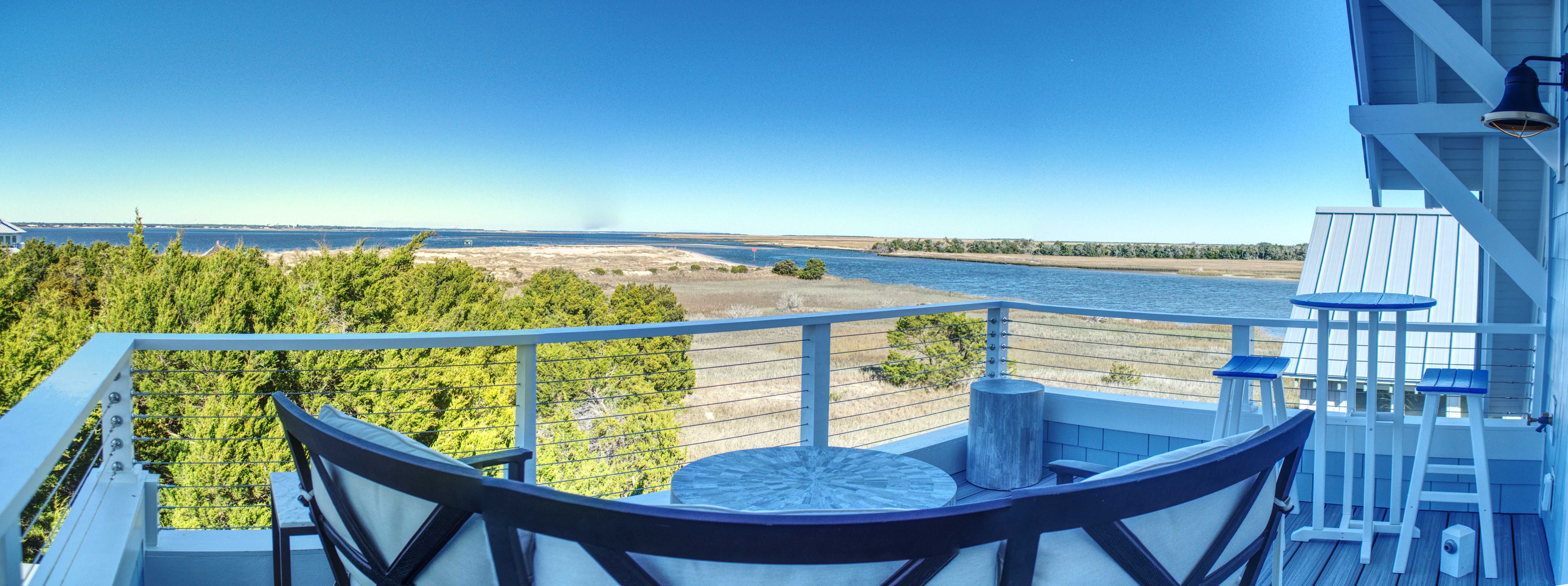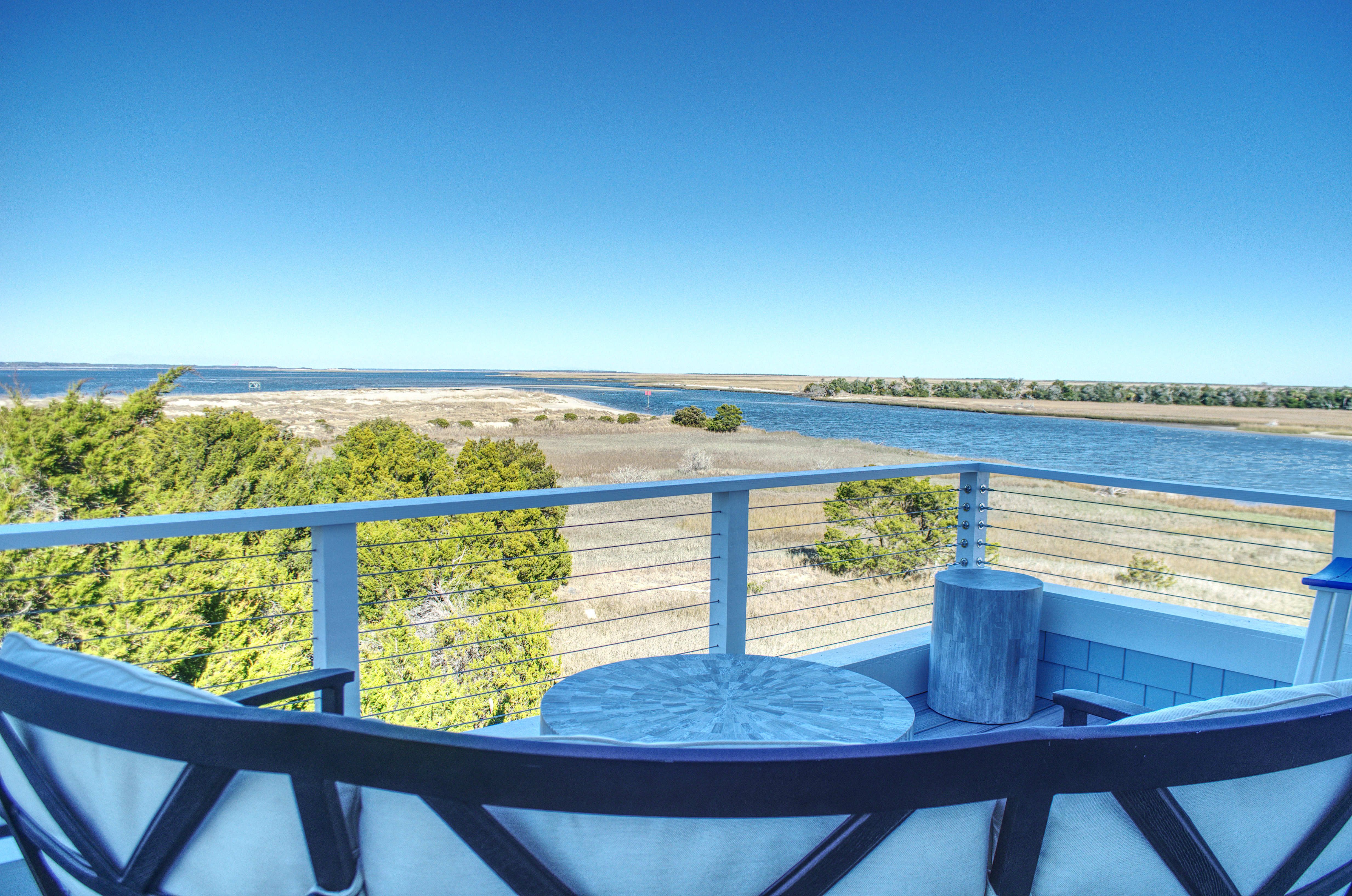 Ascend to the second floor, where the main living area, kitchen, fireplace, and dining room create the perfect space for entertaining and bonding with loved ones. A half bath adds convenience, while the screened-in rear porch, complete with custom outdoor furnishings, offers breathtaking views of the mouth of Bald Head Creek and the vast ocean beyond. For those who appreciate the finer things in life, the covered front porch provides an elegant setting for alfresco dining at an 8-person outdoor table.