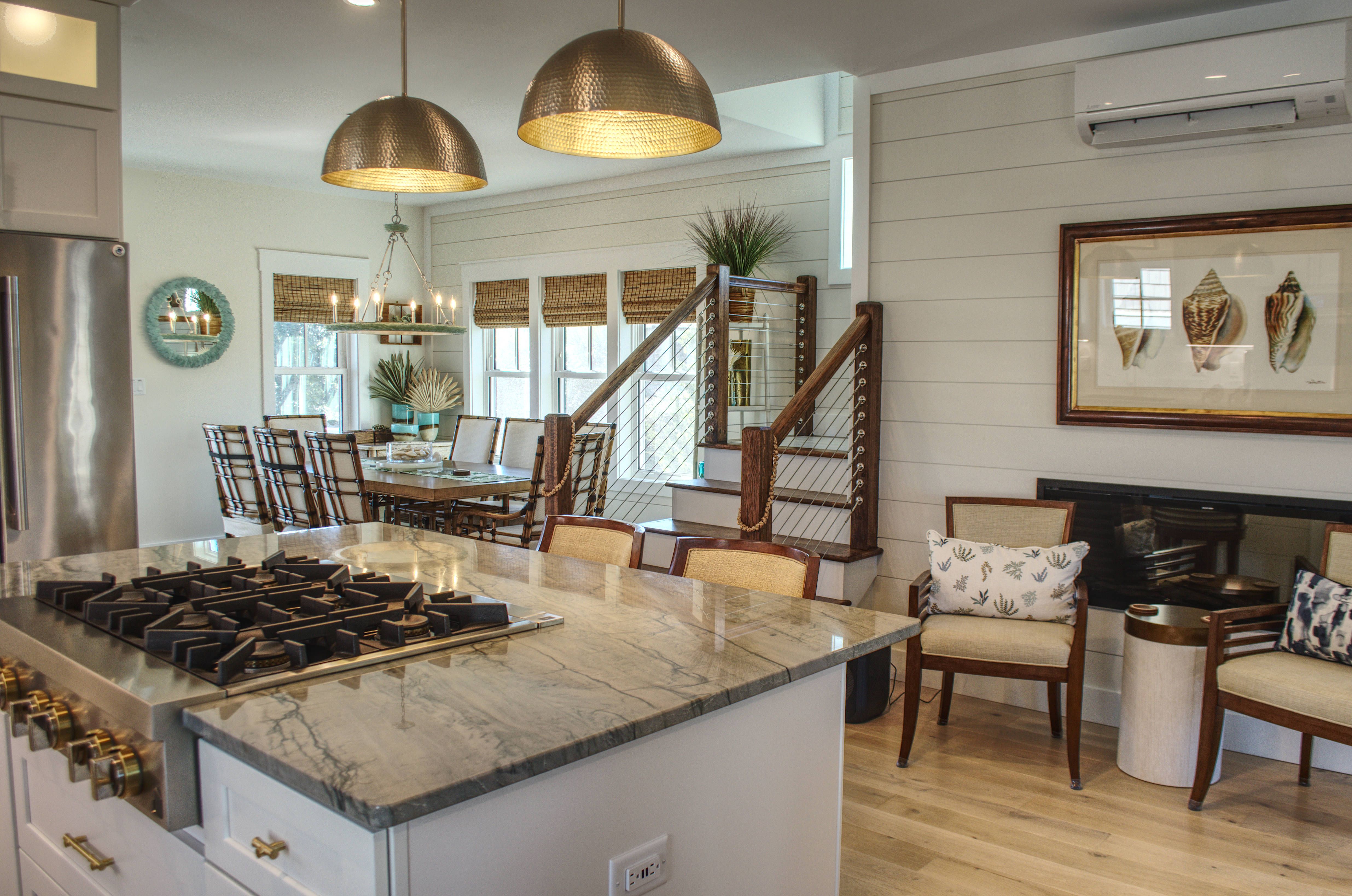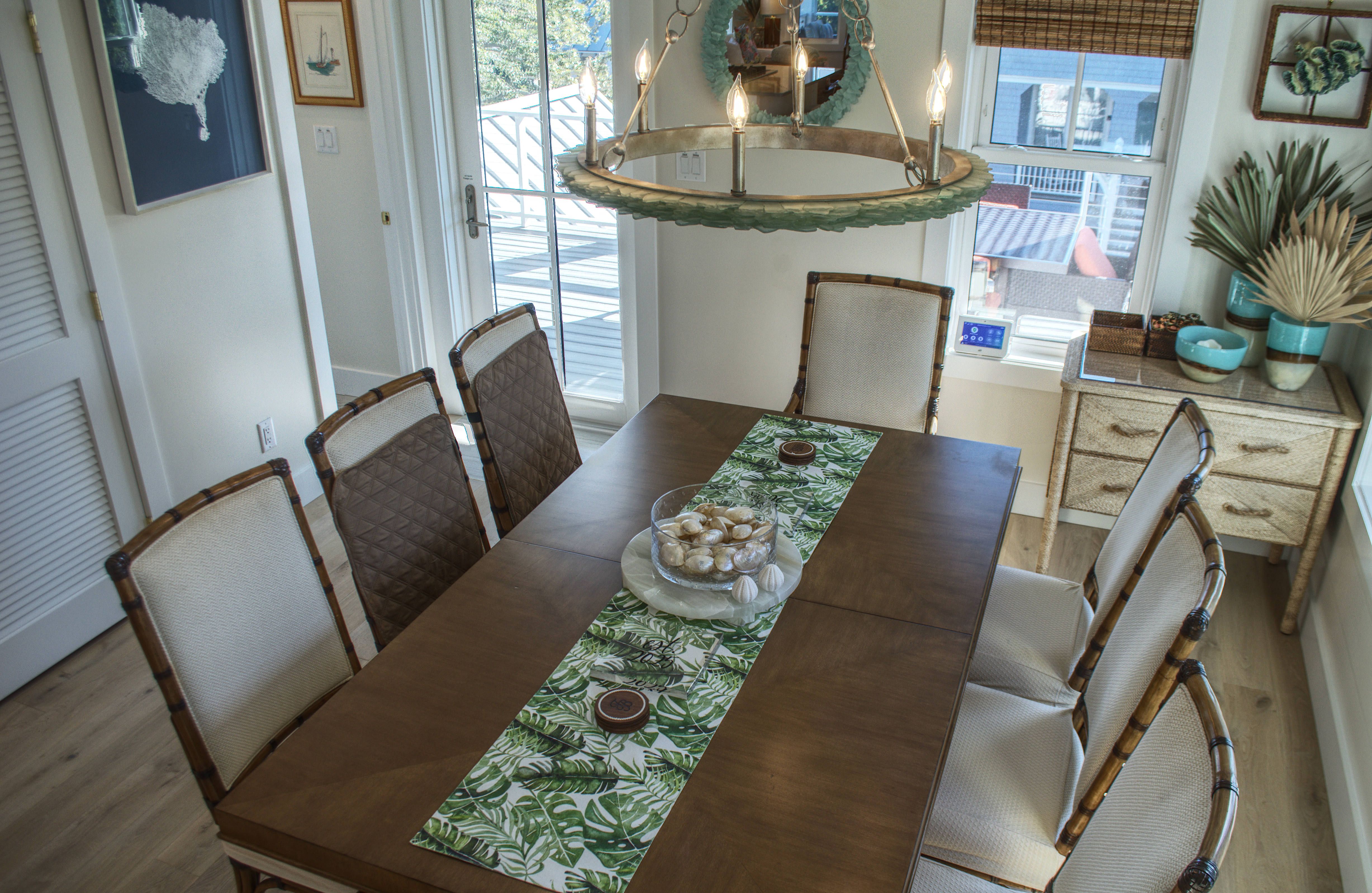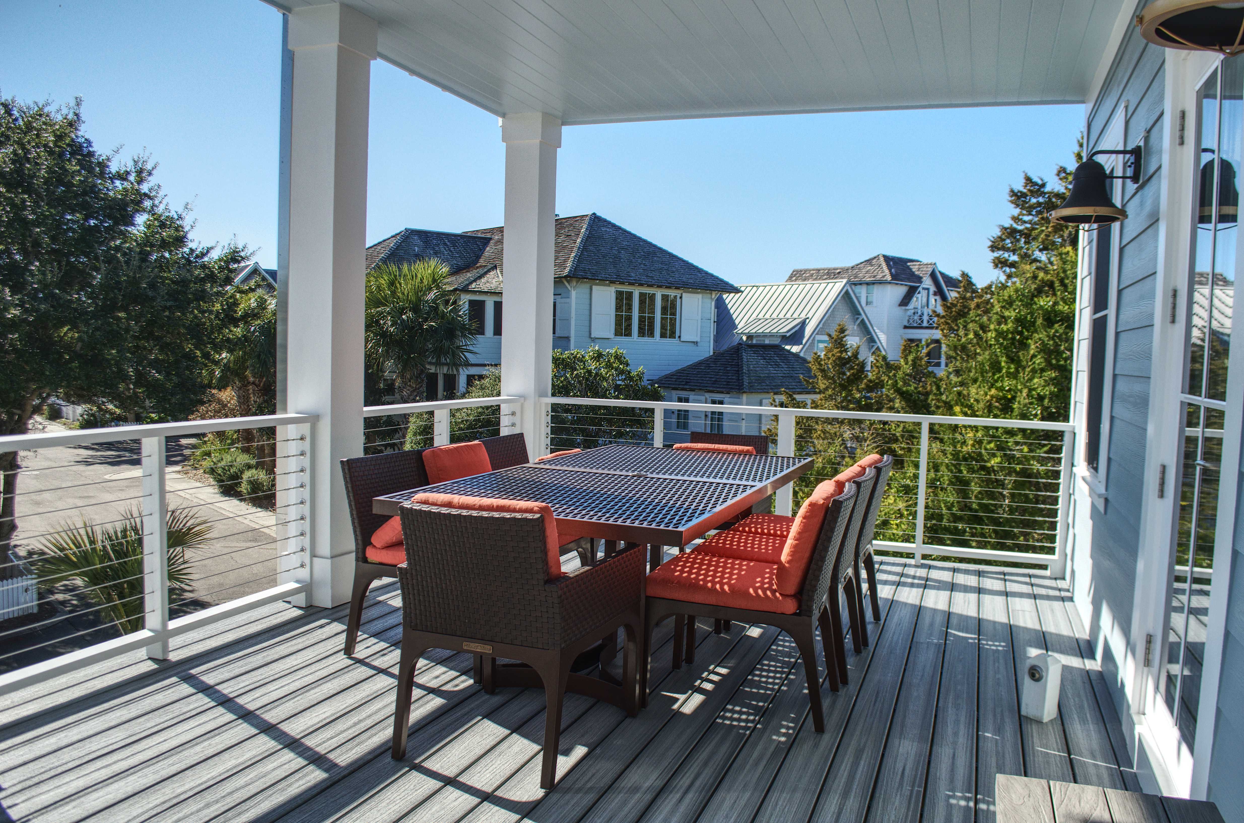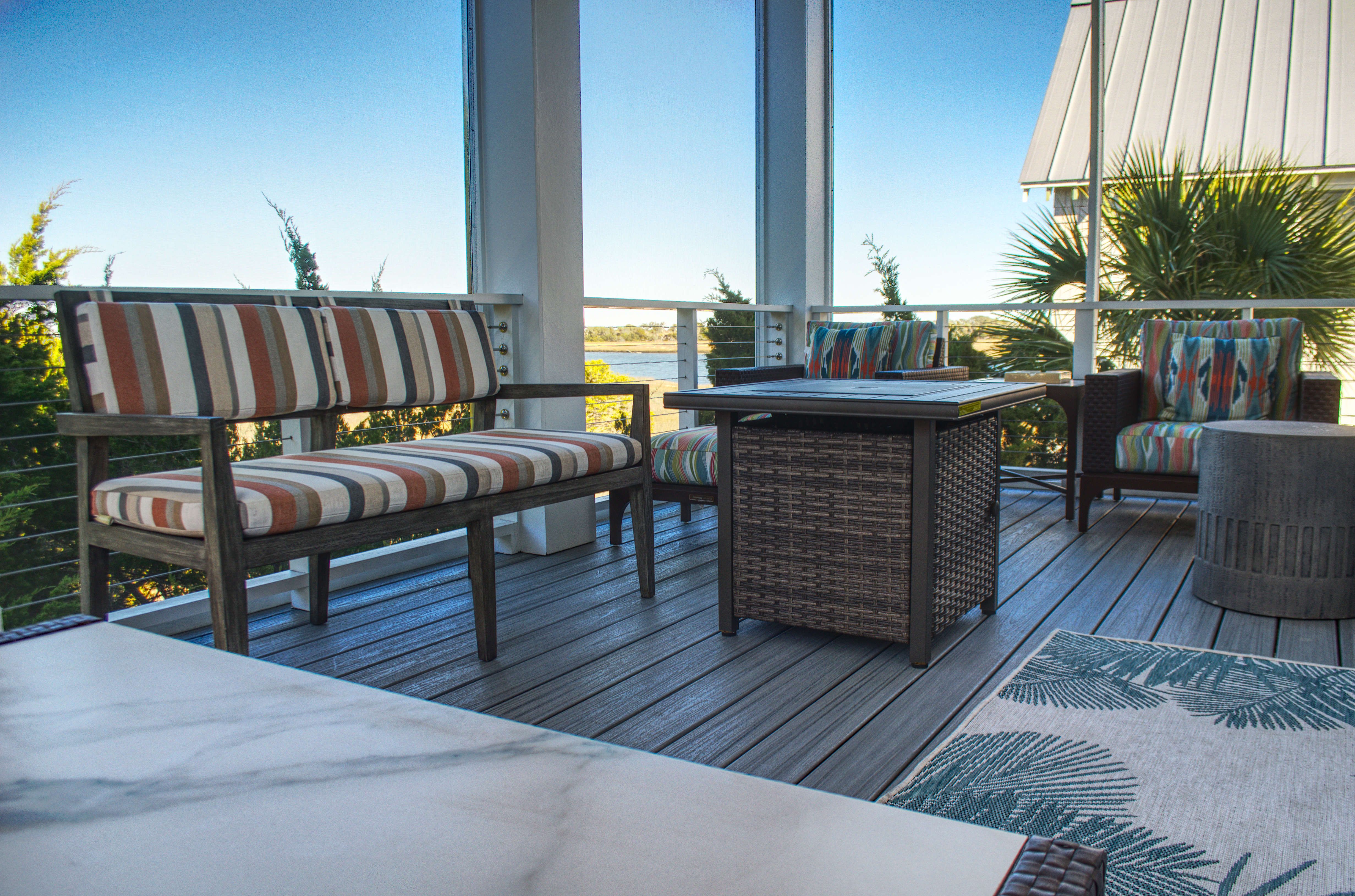 Ascend to the second floor, where the main living area, kitchen, fireplace, and dining room create the perfect space for entertaining and bonding with loved ones. A half bath adds convenience, while the screened-in rear porch, complete with custom outdoor furnishings, offers breathtaking views of the mouth of Bald Head Creek and the vast ocean beyond. For those who appreciate the finer things in life, the covered front porch provides an elegant setting for alfresco dining at an 8-person outdoor table.